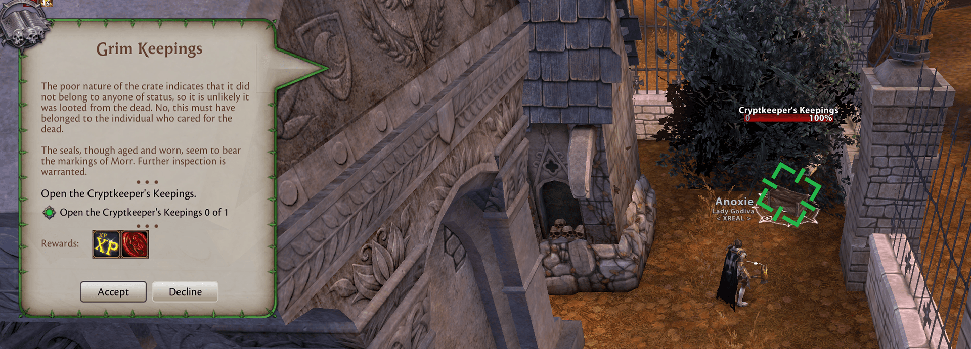 Fly to Reikland and run West back into Talabecland, then head to Dortwald, there is a grave yard there, go in and go to the left between the two crypt buldings to find a chest in the bush called Cryptkeeper's Keeings. Click it twice to get the item.