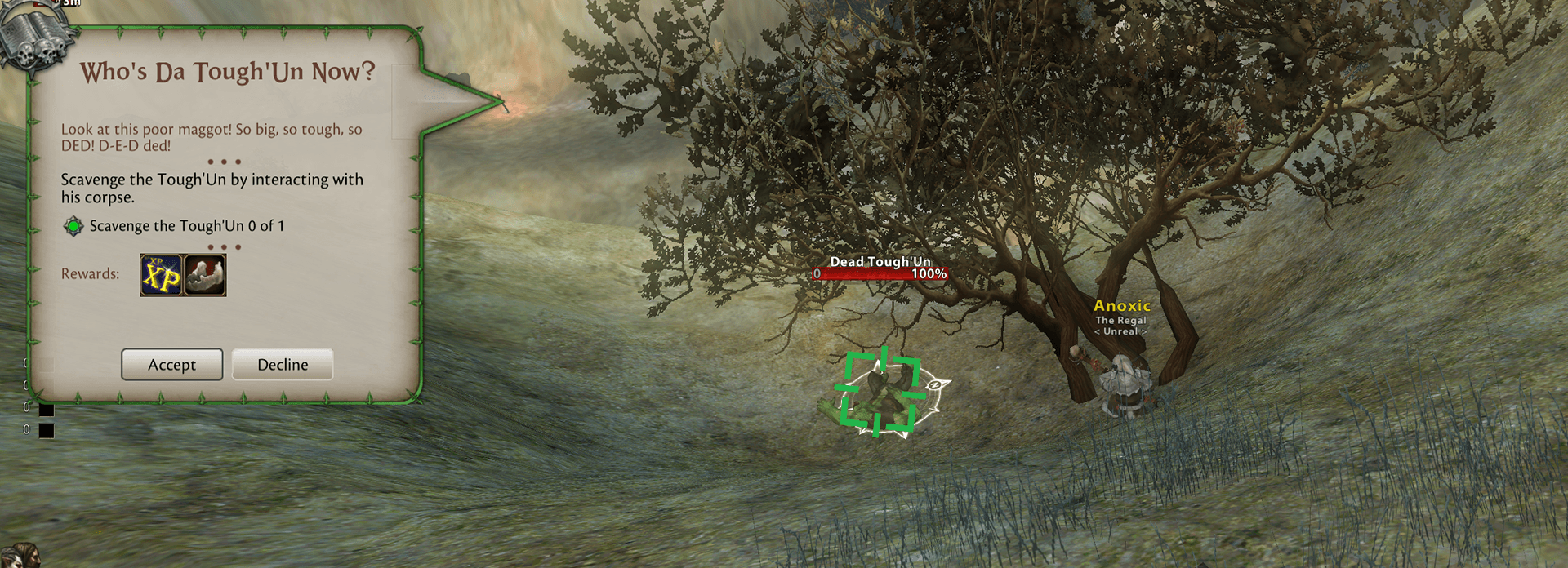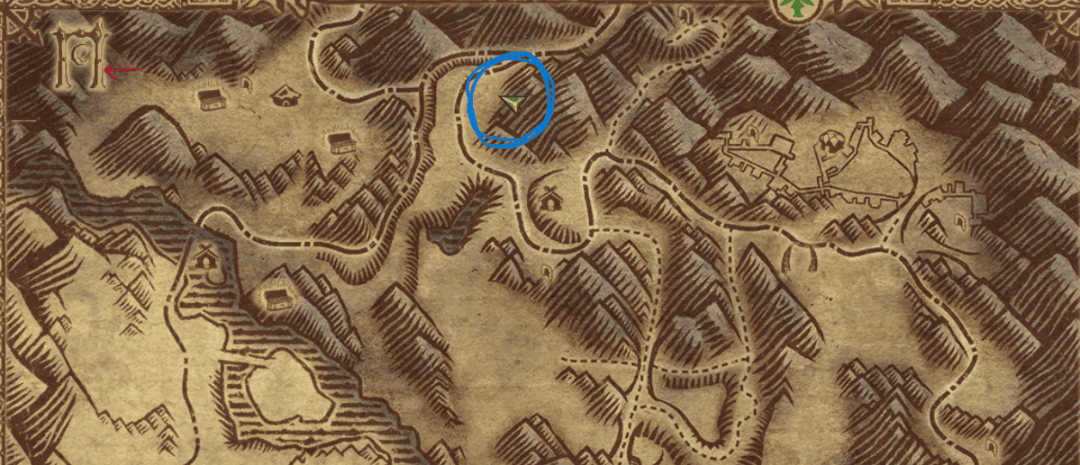 Fly to Black Fire Pass and run south into the Badlands, or Fly to the Badlands and die from mobs when you are in Chapter 11 to fast-travel to that camp. Look for a Dead Tough'Un up the cliffs and click on it twice.
