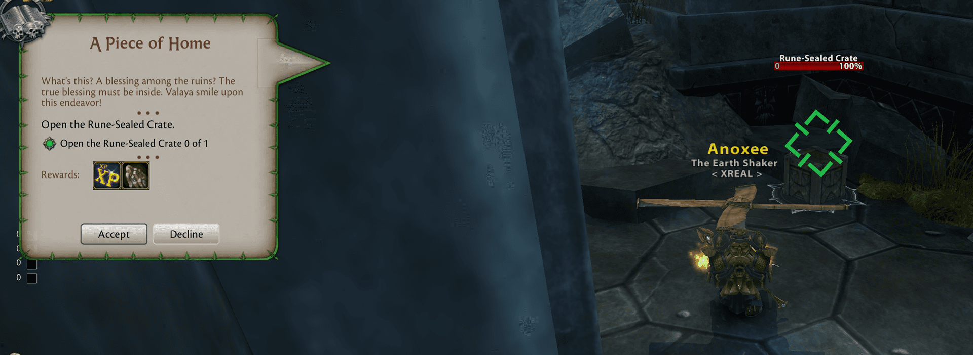 Fly to The Badlands and run south to the Kazad Drung PQ. Go over the hill to the broken tower and go inside to find the Rune-Sealed Crate. Click it twice to get the item.